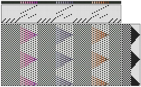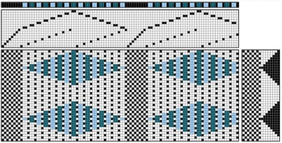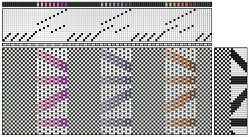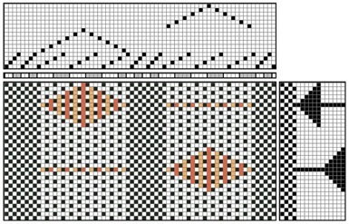 With a looser tension on the extra threads which embellish the face, some surprising effects happen when the fabric is not under tension on the loom, especially on the longer floats. When hand weaving it is easy to make variations when the ornamental thread are on one group of shafts, in the case above between 9 -16, then it is very easy to experiment with different forms. of course dependant the shafts available.