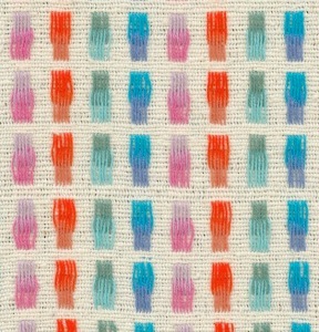 If the take up of the extra warp threads is different from the ground cloth, and it usually is, then two warp beams are needed to regulate the tension. With the ornamental stripes on a separate beam, the colourways can be quickly changed if the ground cloth stays the same and only a new warp is needed for the colourful decorative pattern. For industrial production the bands of colour should be spread evenly on the extra beam to avoid warping and tension problems.