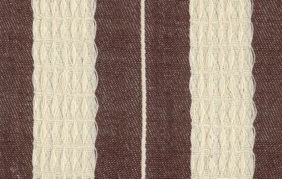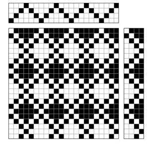 Honeycomb weave gets its three dimensional effect from the contrast between the plain weave in a diamond shape and the warp ad weft floats. Where the diagonals meet forms the middle of the cell and the warp and weft floats the highest point. Above are three examples but there are many variations depending how tight or loose the structure needs to be. It is often used in a fine version for tea cloths, especially combined with plain weave panels. The take up of the warp will become slack in the honeycomb stripes therefore it is practical to alternate the structures to keep the tension of the warp even.
