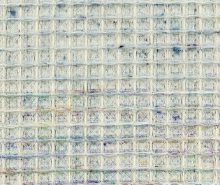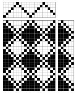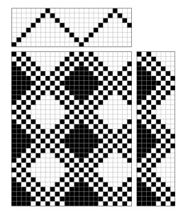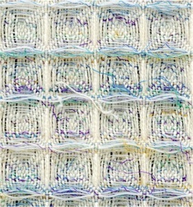 Honeycomb weave gets its three dimensional effect from the contrast between the plain weave in a diamond shape and the warp ad weft floats. Where the diagonals meet forms the middle of the cell and the warp and weft floats the highest point. Above are three examples but there are many variations depending how tight or loose the structure needs to be. It is often used in a fine version for tea cloths, especially combined with plain weave panels. The take up of the warp will become slack in the honeycomb stripes therefore it is practical to alternate the structures to keep the tension of the warp even.