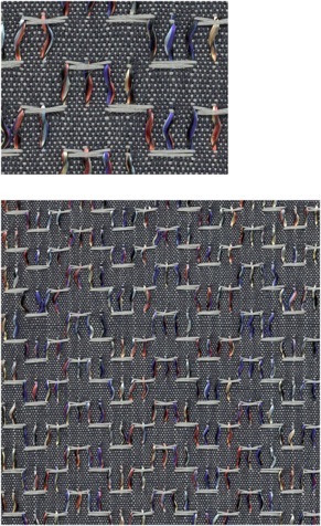 With the same thread up, the surface space-dyed warp threads are dragged left or right by the silver filament rayon weft. It is advisable to work with two beams, one for the basis background threads and one for the effect yarns with a looser tension.