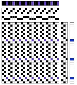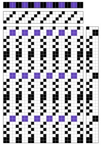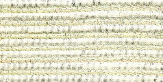 The three dimensional effect is reached by weaving plain weave on the threads on the first two shafts for a specified length. Long floats appear on the reverse side Then by dropping the first two shafts and lifting the third shaft all the plain weave warp threads go to the reverse side. At this moment the welt is made. It works even better if the stitching threads are on a separately tensioned beam. Halfway through the plain weave section if all the warp threads on shaft 1 7 2 are lifted a filling weft can be introduced in the shed to fill the rib.