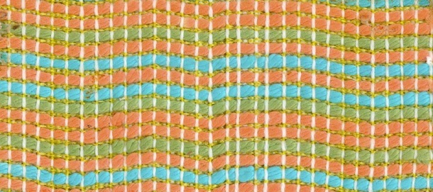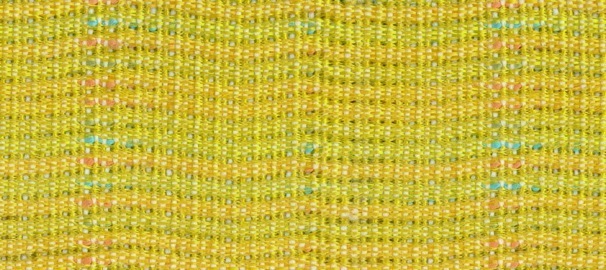 Here the yellow plain weave face has a transparent character The brightly coloured thick filling weft shows through. Also the stitching ends are threaded over more shafts to give an undulating effect like a piqué.